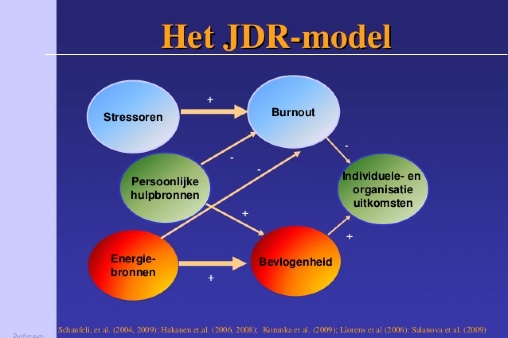 Dit model beschrijft de samenhang tussen ‘taakeisen’ en ‘energiebronnen’. Taakeisen die ons uitputten zijn bijvoorbeeld: conflicten op het werk, te hoge werklast, emotioneel zware gebeurtenissen, onduidelijke rol, gebrek aan grenzen tussen werk & privé, routine, weinig feedback, beperkte invloed op werkzaamheden en gebrek aan inspraak bij beslissingen. Wanneer er teveel factoren zijn die je uitputten en te weinig die energie geven, kan dat leiden tot een burn-out. Je voelt je uitgeput, verliest interesse in taken en presteert steeds slechter.